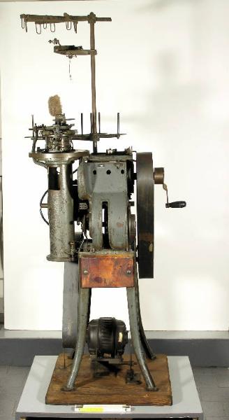 La macchina è formata da un meccanismo ad aghi per la realizzazione dell'intreccio, un supporto porta rocca in alto e un motore in basso, vicino alla base. Etichetta metallica sul motore: "Ercole Marelli & C. Spa - Motore asincrono 3 fase - Ord. 75655 - N° 048432 - Tipo A 216 - Cav.: 0,5 - KW: 0,368 - Serv. cont. - HZ: 50 - V. 380 . n°935 - A. 1.770.98"
