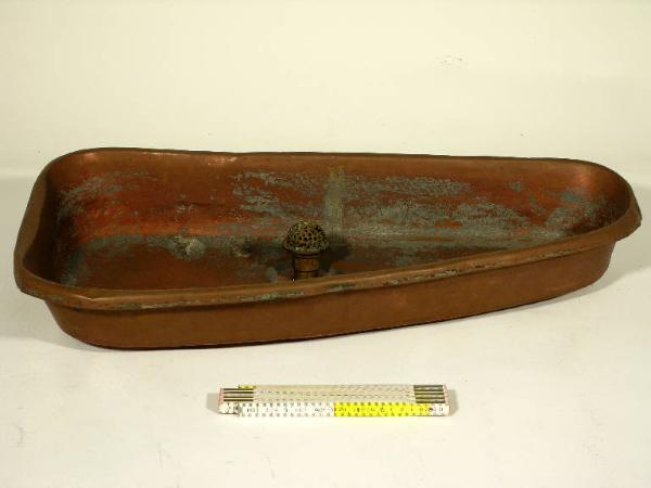 L'oggetto è una bacinella di forma allungata con un rubinetto forato sul fondo, per consentire l'ingresso dell'acqua. L'oggetto era parte integrante di una macchina, artigianale, per la scopinatura e trattura del filo