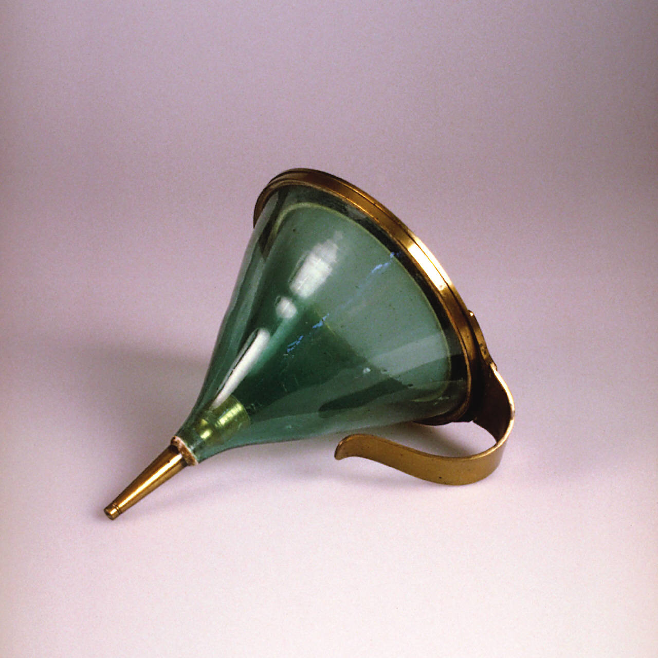 L'imbuto magico si compone di due coni di vetro, posti uno nell'altro, in modo da formare una intercapedine fra i due. Il cono interno termina con una coda di ottone, mentre quello esterno finisce un po' più in basso sulla stessa coda. Su questo piccolo tratto della coda è praticato un piccolo foro che mette in comunicazione l'intercapedine con il cono interno. Un altro piccolo foro praticato nell'anello di ottone che fissa i due coni mette in comunicazione l'intercapedine con lo spazio esterno.