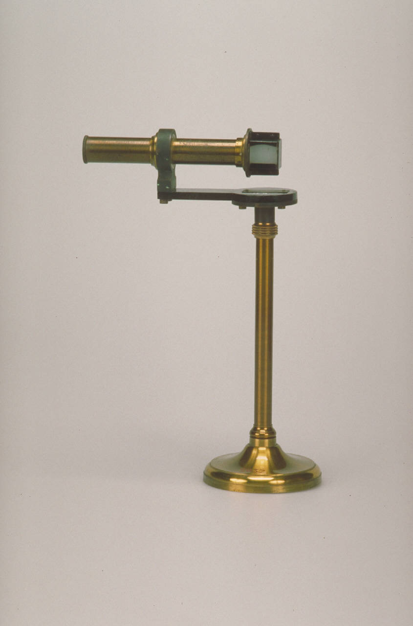 Due parallelepipedi di vetro opale, combacianti perfettamente per una faccia e separati tramite un sottile foglio opaco sono fissati all'estremità di un tubo di ottone, munito di un oculare al'altra estremità. \nIl tubo è fissato a un manico che poteva scorrere in un piedestallo (oggi mancante).