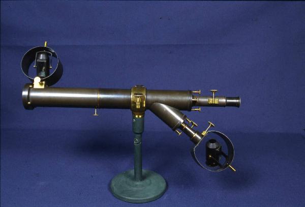 Giunto a Milano nel maggio del 1866. fu pagato 600 lire. Era stato proposto a Schiaparelli da G. B. Donati, studioso di ottica e progettista di strumenti ottici fiorentino, che l'aveva già usato per qualche osservazione prima dell'invio. \nNon sembra che sia mai stato impiegato dagli astronomi braidensi in ricerche sistematiche. È uno spettroscopio a visione diretta. Consiste in un tubo metallico verniciato che contiene 5 prismi: una estremità ha una flangia filettata per avvitarlo al telescopio, l'altra estremità porta l'oculare. \nAll'estremità opposta all'oculare si trova la fenditura, la cui larghezza è regolata per mezzo di una chiavetta estraibile. Sul tubo. a fianco della fenditura. è possibile appendere una piccola lampada. con sospensione cardanica, in cui veniva bruciato dell'alcool salato per ottenere le righe gialle di riferimento del sodio: la luce della lampada era inviata nello spettroscopio per mezzo di un piccolo prisma. \nNella osservazione delle stelle si poneva davanti alla fenditura una lente cilindrica per inviare sulla fenditura una maggiore quantità di luce; questa non veniva usata nelle osservazioni di laboratorio. Verso la metà dello strumento si innesta un secondo tubo, inclinato verso l'oculare. \nAlla sua estremità si attacca una piccola lampada ad olio, anch'essa a sospensione cardanica, che illumina una scala graduata posta all'interno dello strumento; davanti alla finestrella della lampada, per regolare l'intensità della luce, si trova una lastrina di vetro scuro che può scorrere verticalmente sotto l'azione di una vite. Le due lampade sono circondate da una fascia metallica che evita all'osservatore di essere disturbato dalla loro luce. \nLo spettroscopio e le lampade sono contenuti in una cassetta di legno chiusa da una serratura. La cassetta contiene anche un collare metallico che può essere fissato a metà circa dello strumento, in una apposita scanalatura; il collare ha un perno che poteva essere infilato in un sostegno nel caso di uso non astronomico dello strumento. Non c'è più la parte che si poneva davanti alla fenditura, comprendente la lente cilindrica e il piccolo prisma per la riflessione della luce della lampada. \nAll'interno del coperchio della scatola vi è l'etichetta, di carta, del costruttore: "Officina di strumenti ottici e matematici diretta da G. Poggiali con l'assistenza scientifica dei professori G. B. Donati e T. del Beccaro". Il simbolo della casa costruttrice, un triangolo con base orizzontale lungo la quale è scritto Firenze e una stella nel vertice superiore, è riportato nell'etichetta ed è inciso sullo strumento. Sulla scatola è dipinto il numero 7, riferentesi all'inventario 1921.