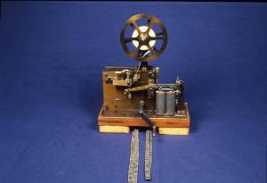 È un dispositivo di tipo telegrafico per la registrazione su una striscia di carta dei segnali provenienti dal micrometro impersonale di uno strumento dei passaggi, o di un cerchio meridiano, e dall'orologio a pendolo. L'apparato è composto sostanzialmente da due parti: il dispositivo per l'avanzamento della carta e le punte scriventi con il relativo sistema di comando. La striscia di carta è avvolta su una bobina portata da un braccio; questo è avvitato sulla parte superiore di una scatola metallica che contiene il roteggio. La striscia passa attraverso una guida ed è trascinata da un cilindro rotante su cui è premuta da un secondo cilindro. \nL'energia per il trascinamento deriva dalla discesa di un peso che è collegato tramite una catena al primo ingranaggio del roteggio contenuto nella scatola metallica; una seconda massa appesa alla stessa catena diminuisce l'accelerazione di caduta. Il peso motore viene fatto risalire, al termine della sua corsa, girando una manovella che può essere svitata per toglierla durante il funzionamento dell'apparecchio. \nLa velocità di scorrimento è mantenuta costante da un regolatore, contenuto nella scatola, costituito da una lastrina sagomata a farfalla; questa è attaccata ad un asse collegato al roteggio: la rotazione dell'asse fa sì che la farfalla si disponga perpendicolarmente all'asse stesso e la resistenza dell'aria sulle sue parti più larghe mantiene costante la sua velocità, quindi la velocità di rotazione dell'asse e dell'intero roteggio.\nUna levetta esterna permette di bloccare l'asse del regolatore, quindi di fermare l'apparato. Il cronografo ha due punte, una per i segnali del micrometro impersonale e una per quelli dell'orologio. Ciascuna delle punte si trova alla estremità di un braccio, imperniato verso la sua metà il braccio, all'altra estremità, passa sopra ad una coppia di elettromagneti ed ha una placchetta di ferro: ogni punta fora la striscetta di carta quando il braccio che la porta viene attratto dagli elettromagneti, il cui circuito è chiuso dall'arrivo del segnale. Le punte possono forare la carta perché il cilindro di trascinamento ha una scanalatura in corrispondenza delle punte, quindi in quella posizione la carta non è a contatto con il cilindro. \nSu ciascun braccio agisce una molla di richiamo che lo mantiene staccato dall'elettromagnete, quando questo non è attivo. \nSullo strumento è inciso "S. Mioni-Padova N. 63".