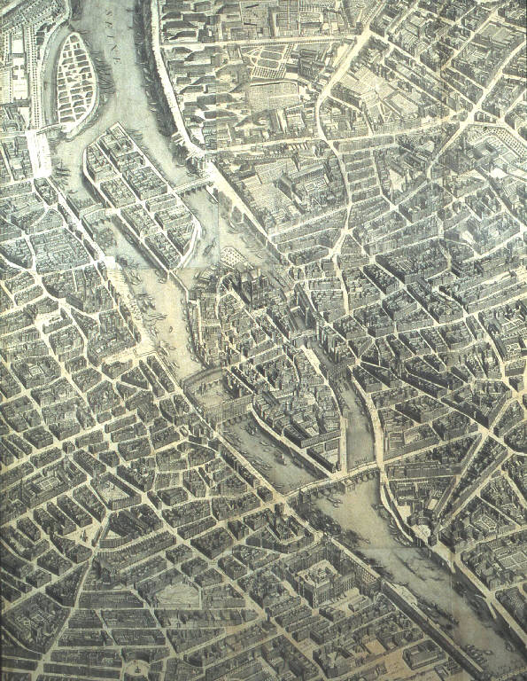 Plan de Paris\nCommencé l¿Année 1734. Dessiné et Gravé, sous les ordres de Messire Michel Etienne Turgot, Marquis de Sousmons, Seigneur \nde St Germain sur Eaulne, Vatierville, et autres lieux, Conseiller d¿Etat, Prevôt des Marchds Henry Millon, Ecuier Coner du Roi, Quartinier; Philippes le Fort, Ecer Jean Claude Fauconnet de Vildé, Ecer Coner du Roi, et de la Ville, Avocat en la Cour, Expéditionnaire de Cour de Rome; Claude Augustin Josset, Ecer Coner du Roi, Avocat en la Cour Expéditre de Cour de Rome; Echevins de la ville de Paris; \nAntoine Moriau, Ecer Procureur et Avocat du Roi, et de la Ville, Jean Baptiste Julien Taitbout, Chevalier de l¿Ordre du Roi, Greffier en Chef, Jacques Boucot, Chevalier de l¿Ordre du Roi, Receveur. \nAchevé de Graver en 1739. \nLevé et Dessiné par Louis Bretez|Gravé par Claude Lucas|Et Ecrit par Aubin