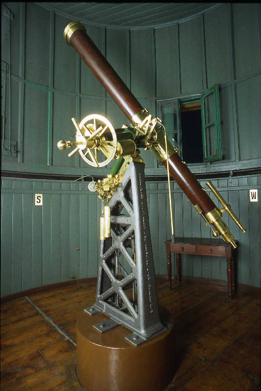 Lo strumento fu ordinato nel novembre 1862 da Giovanni Virginio Schiaparelli (1835-1910), diventato direttore dell¿Osservatorio nell¿agosto dello stesso anno. Da tempo era molto sentita la necessità di un nuovo strumento che era stato richiesto inutilmente più volte al governo austriaco, sempre meno impegnato nello sviluppo di questa parte dell¿impero. Nel 1859, con l¿armistizio di Villafranca, la Lombardia veniva annessa al Piemonte e il nuovo governo dimostrò subito una maggiore sensibilità per i problemi dell¿Osservatorio; la stessa nomina di Schiaparelli doveva costituire un segno di rinnovamento. La richiesta per un nuovo strumento fu accolta rapidamente, grazie anche all¿interessamento di Quintino Sella; sull¿approvazione dell¿acquisto pesò il prestigio recentemente conquistato da Schiaparelli con la scoperta di un nuovo pianetino, Esperia, avvenuta la sera del 29 aprile 1861. Il telescopio giunse a Brera nell¿estate del 1865. Schiaparelli aveva deciso di collocarlo nella torre Nord-Est, al posto della montatura provvisoria costruita per uno specchio di Amici, mai utilizzato pienamente. Bisognava però costruire una nuova cupola e l¿astronomo si era preoccupato già dal 1863 di richiedere dei progetti, ma il costo di questi superava il finanziamento accordato dal governo. Solo nel 1873 venivano stanziati i fondi necessari e i lavori potevano cominciare, finendo l¿anno successivo. Alla fine del 1874 il telescopio era finalmente posto nella nuova cupola; le osservazioni regolari cominciarono nel febbraio 1875, dopo un periodo preliminare di verifiche dello strumento. Nelle intenzioni iniziali, il telescopio doveva essere usato per osservazioni di pianetini, comete e stelle doppie, ma con il nuovo telescopio Schiaparelli iniziò anche, abbastanza casualmente, una lunga serie di osservazioni planetarie che dovevano renderlo famoso fra il grande pubblico. Oltre alle determinazioni, di grande interesse astronomico, dei periodi di rotazione di Venere e Mercurio, Schiaparelli osservò lungamente Marte, a partire dall¿opposizione, particolarmente favorevole, del 1877. Il tubo del telescopio, di legno d¿abete e di mogano, è sostenuto da una montatura equatoriale. È alloggiato in una culla d¿ottone, come in tutte le montature di tipo tedesco, ad una delle estremità dell¿asse di declinazione che a sua volta scorre in una guaina fissata all¿estremità superiore dell¿asse orario; questo asse, perpendicolare al primo, è diretto verso il polo celeste Nord. All¿estremità libera dell¿asse di declinazione si trova il cerchio di declinazione; il cerchio di ascensione retta è all¿estremità inferiore dell¿asse orario. L¿osservatore, rimanendo all¿oculare, poteva impartire movimenti micrometrici al telescopio per mezzo di due lunghe aste. Lo strumento era equilibrato da contrappesi. L¿obbiettivo è un doppietto di 218 mm di apertura e 3.15 m di lunghezza focale (f/14.5). Dai risultati ottenuti nelle misure di stelle doppie si ricava che la sua risoluzione effettiva era abbastanza vicina alla risoluzione teorica, che secondo il criterio di Rayleigh è pari a 0."6 (per una lunghezza d¿onda di 560 nanometri). L¿obbiettivo mostra una leggera colorazione verde che era già presente ai tempi di Schiaparelli; è inoltre acromatico nella regione rosso-verde dello spettro, mentre produce un eccesso di azzurro: Schiaparelli correggeva l¿effetto utilizzando un filtro giallo carico o arancione. Il telescopio è dotato di un cercatore e di un dispositivo di illuminazione e dei fili del micrometro, costituito da due lampade (i fori di ingresso della luce nel tubo del telescopio potevano essere schermati con filtri colorati, montati su un cerchio). Era corredato anche di due micrometri a filo mobile (si veda scheda 30), di un micrometro anulare, di 13 oculari, 7 positivi e adattabili al micrometro filare (con ingrandimenti compresi fra 87 e 690) e 6 negativi (con ingrandimenti da 67 a 468).