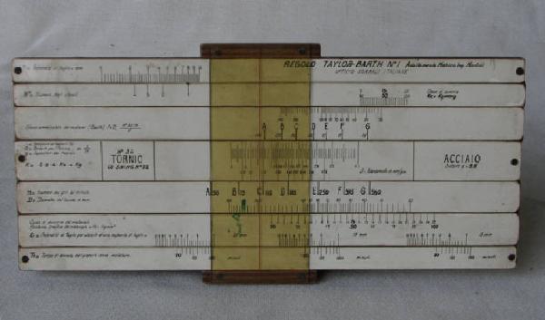 Regolo in legno costituita da una tavoletta sulla quale sono fissate tre aste di cui due alle estremità e una al centro. Tra queste si trovano altre quattro aste scorrevoli.\nSulle aste, verniciate di bianco, si trovano le scale di misura e le indicazioni dei parametri misurati: profondità di taglio, numero degli utensili, classe di durezza, sforzo ammissibile dei ruotismi, avanzamento in mm/giro del tornio, profondità di taglio per utensile con fissata capacità di taglio, tempo di durata dell'utensile senza molatura.\nLungo i lati lunghi del regolo è inserita una lastra in materiale plastico trasparente che può scorrere lungo il regolo, con stampata una riga rossa trasversale che permette la lettura della misura sulle scale (cursore).