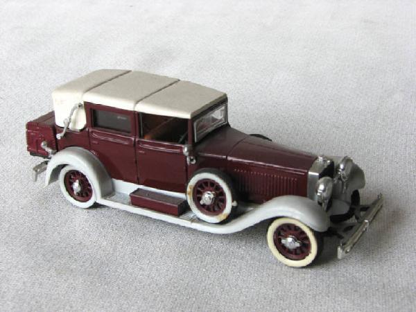 Modellino di automobile Isotta Fraschini tipo 8A "landaulet imperiale" in scala 1:43. Poggia in un contenitore in plastica trasparente nel quale è presente anche un foglietto illustrativo con la storia del modello di automobile.