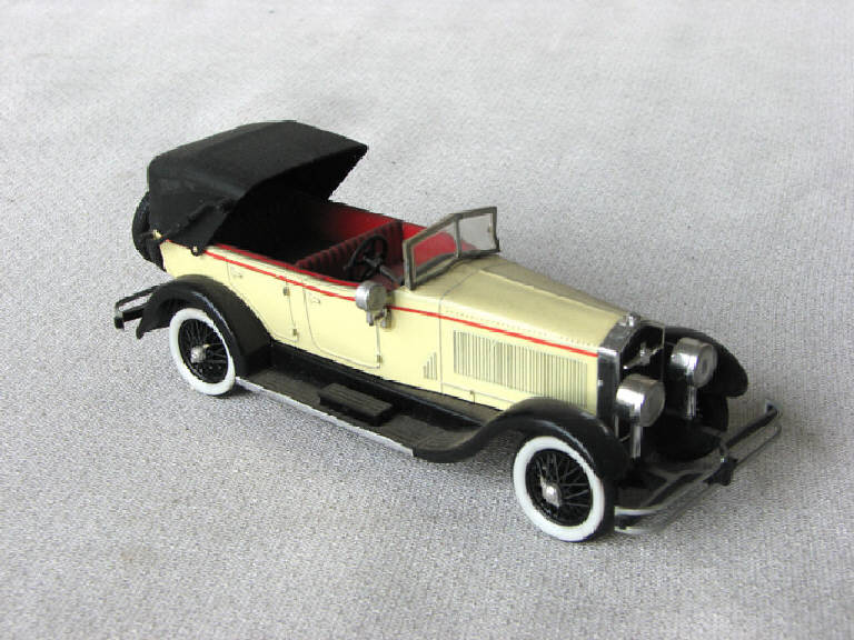 Modellino di automobile Isotta Fraschini tipo 8A "torpedo speciale" in scala 1:43, carrozzeria Castagna. Poggia in un contenitore in plastica trasparente nel quale è presente anche un foglietto illustrativo con la storia del modello di automobile..