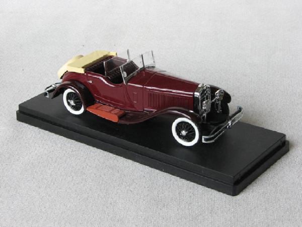 Modellino di automobile Isotta Fraschini tipo 8A "spyder" in scala 1:43. Poggia su una base in plastica nera con coperchio in plastica trasparente nel quale è presente anche un foglietto illustrativo con la storia del modello di automobile.