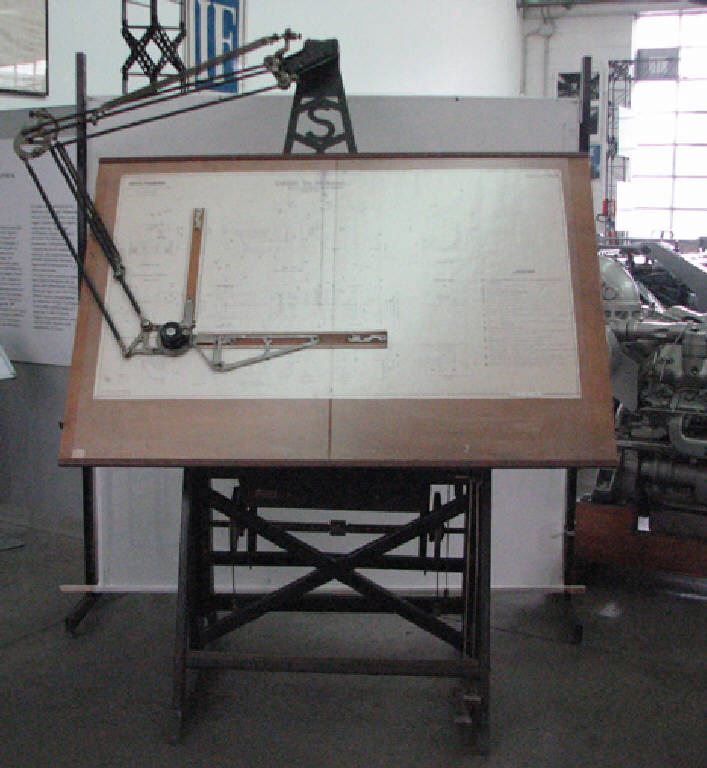 Su una struttura in legno è fissata una tavola rettangolare, anch'essa in legno, i posizione leggermente obliqua. L'inclinazione della tavola e l'altezza a cui è posta possono essere variate agendo su due pedali posti sulla base. Alla struttura in legno sono fissati dispositivi di trasferimento del moto dai pedali ai sostegni della tavola. Al centro della struttura si trova un cassetto porta cancelleria.\nAlla parte alta della struttura sono collegati due dispositivi costituiti da aste e molle, collegate con contrappesi posti sul retro, con uno snodo centrale, che terminano con due righe in legno sulla tavola di lavoro. Quella orizzontale permette misure da 0 a 50cm, quella verticale da 0 a 35cm. Le due righe, che costituiscono il braccio del tecnigrafo, sono ortogonali tra loro e sono collegate ad un goniometro mediante il quale è possibile ruotarle (da 0 a 40° in senso antiorario e da 0 a 100° in senso orario).\nSulla tavola è appoggiato un diegno tecnico che riproduce lo chassis dell'autovettura Isotta Fraschini Tipo 8A normale in scala 1:10. Il disegno è protetto da due fogli di materiale plastico trasparente.