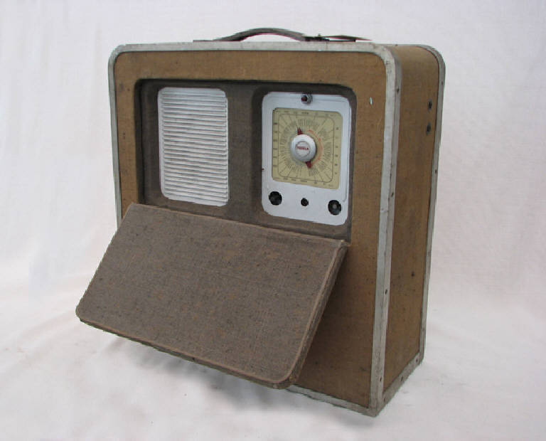 Apparecchio radio da tavolo in legno ricoperto in tessuto di forma parallellepipeda poggiante su quattro piedini. E' presente una maniglia per il trasporto.\nLa parete frontale è parzialmente apribile. Aprendo lo sportello, incernierato nella parte bassa, si accede all'altoparlante elettrodinamico, collocato nella parte sinistra, e ai comandi per l'accensione e la sintonizzazione, nella parte destra.\nIl dispositivo di sinistra permette l'accensione dell'apparecchio, il commutatore centrale la scelta della tipologia delle frequenze (onde corte o medie), il dispositivo di destra è il comando di sintonia e permette di selezionare la frequenza desiderata che viene letta sul quadrante sopra ai comandi dove sono indicate le località, le lunghezze d'onda in metri (da 19 a 54), i K/cicli (da 530 a 1445).\nLe rotelle che permettono l'uso dei dispositivi di accensione e selezione sono mancanti.\nLateralemnte sono inseriti due fori per il collegamento dell'antenna e della messa a terra.\nLa parete posteriore è incernierata nella parte alta ed apribile.\nAll'interno è visibile il circuito supereterodina con gli alloggi per le 5 valvole e il vano per le batterie per il funzionamento in corrente continua, attualmente non disponibili.