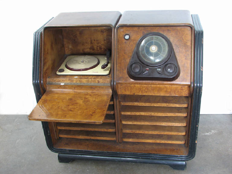 Questo radiofonografo ha l'aspetto di un mobile in radica di forma trapezoidale. Si presenta suddiviso in due parti affiancate. La parte di sinistra comprende il giradischi e alcuni ripiani per conservare i dischi, quella destra i comandi della radio e l'altoparlante (potenza d'uscita 11W) protetto da una maglia in tessuto e da ripiani in legno che richiamano quelli porta dischi.\nIl giradischi è custodito dietro ad uno sportello apribile, incernierato nella parte bassa. E' costituito da un piatto girevole ricoperto di materiale plastico antiscivolo e da un'asta rotante sulla quale è collocata la puntina. Una rotella permette la selezione dei giri (78, 33, 45).\nLa scala di sintonia della radio è di tipo circolare e sono presenti quattro scale con indicate le località e le lunghezze d'onda in metri per onde cortissime, corte, medie, lunghe. Nel foro posto sul mobile, accanto al quadrante, era probabilmente inserito l'indicatore visivo di sintonia detto "occhio magico".\nLa scala di sintonia è inserita su un quadrante triangolare che comprende anche due manopole e due selettori per la ricerca della sintonia, la regolazione del volume e dei toni, la gamma d'onde. La parete posteriore è mancante e sono visibili l'altoparlante, gli alloggiamenti delle otto valvole (mancanti) e il circuito supereterodina, il motorino del giradischi e gli altri dispositivi di funzionamento.\nIn un ripiano è inserito un album in cartone e tessuto, contenente 12 dischi 78 giri, ciascuno in una busta in carta.