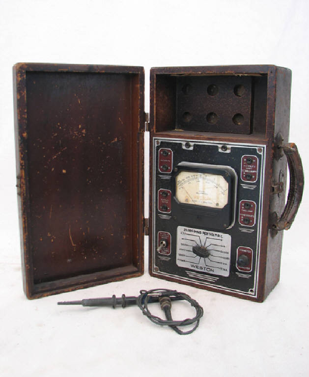 Strumento di misura inserito in una custodia in legno con un vano porta accessori. LA custodia ha maniglia in cuoio e dispositivo di chiusura.\nAl centro è inserito il quadrante di misura con diverse scale graduate per misure di resistenza (scala logaritmica con indicazioni numeriche da 0 a 300 Ohm), di tensioni in corrente continua (tre scale lineari in una con indicazioni numeriche da 0 a 5V, da 0 a 10V, da 0 a 25V), di correnti alternate (tre scale lineari in due con indicazioni numeriche da 0 a 2,5mA, da 0 a 10mA e da 0 a 50mA). \nSotto al quadrante si ha un selettore per fissare il fondo scala.\nIntorno si hanno quattro coppie di boccole per il collegamento della sonda con la quale si fanno le misure: una per tensioni in alternata, una per misure di tensioni in corrente continua di resistenze e di correnti continue dell'ordine dei mA, una per correnti dell'ordine di 1mA-100mA, l'ultima è per collegamento in uscita (output meter).\nAccanto al selettore si ha un deviatore per selezionare il tipo di misura: correnti alternate-output meter oppure correnti continue, mA, resistenze. Si ha inoltre un commutatore per le misure di resistenze.