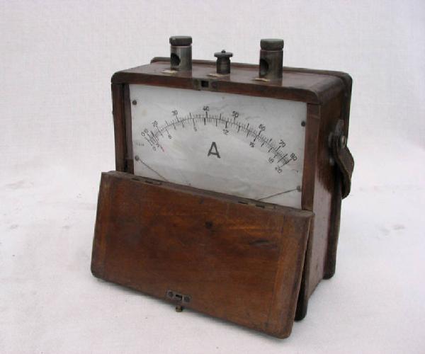 Strumento di misura per correnti racchiuso in una scatola in legno con un vetro nella parte del quadrante di misura. Metà della parete frontale è infatti incernierata nella parte bassa ed apribile. Il quadrante presenta una lancetta indicatrice imperniata nella parte bassa e una doppia scala di lettura: scala logaritmica da 0 a 80 Ampere e scala lineare da 0 a 20 Ampere.\nSuperiormente si hanno tre connettori per i collegamenti elettrici.