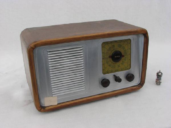 Apparecchio radio da tavolo in legno di forma parallellepipeda poggiante su due piedini rettangolari in legno.\nNella parte sinistra della parete frontale in metallo troviamo l'altoparlante magnetodinamico e nella parte destra i comandi per l'accensione e la sintonizzazione.\nLa rotella di sinistra permette l'accensione dell'apparecchio, il commutatore centrale la scelta della tipologia delle frequenze (onde corte o medie), la rotella di destra è il comando di sintonia e permette di selezionare la frequenza desiderata che viene letta sul quadrante sopra ai comandi dove sono indicate le località, le lunghezze d'onda in metri (da 15.8 a 50), i K/cicli (da 505 a 1581).\nLa parete posteriore è mancante. Dal retro sono visibili le quattro valvole ECH4 e il circuito supereterodina di funzionamento.\nDal retro fuoriesce il cavo di collegamento alla rete elettrica, non originale.