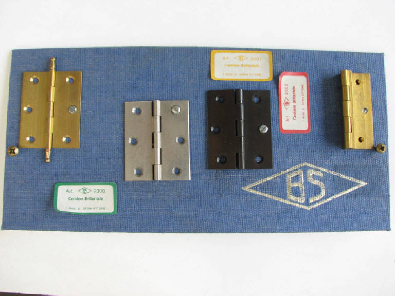 Su un pannello in legno ricoperto i tessuto blu sono fissate quattro cerniere di forma rettangolare con spigoli vivi. Tre dritte e una curva.\nDue (art. 2001) sono costituite da due alette rettangolari piatte in ferro che terminano da un lato rispettivamente con due e tre cilindri cavi in fila. Queste alette sono tenute insieme da una spinetta che si inserisce nei cilindri cavi. Ciascuna aletta presenta tre fori per il fissaggio mediante viti. Una cerniera è in ferro cromato e l'altra brunito.\nUn'altra cerniera (art. 2000) è come le precedenti ma la spinetta fuoriesce dal profilo della cerniera e termina con un elemento conico e una sferetta. Questa è in ottone lucido.\nL'ultima (art. 2002), in ottone lucido, è del tutto simile alle precedenti ma le alette non sono piatte ma hanno profilo a 90°.\nSul pannello è presente il marchio aziendale.