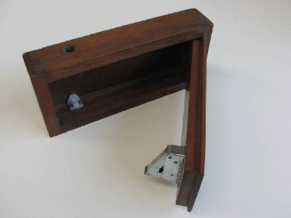 Chiusura a scatto in acciaio costituita da un elemento di forma parallelepipeda da fissare all'anta del mobile. Nella parte alta è imperniato un altro elemento in acciaio che termina, all'altra estremità, con una rotella. Questo elemento è vincolato nella parte alta ma libero di muoversi in un piano verticale. Sul ripiano interno del mobile si posiziona un fermo costituito da un cavallotto in plastica con una scanalatura per incastrare la rotella dell'elemento sull'anta. Questo cricchetto è montato su una scatola in legno con anta di chiusura per scopi dimostrativi.