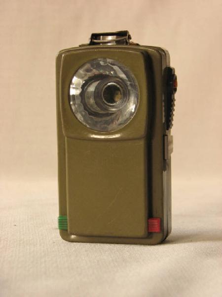 scatola metallica con oblò di vetro sul davanti ed interruttore sul fianco.Apribile per il cambio batterie e lampadine.Poteva diffondere luce di colore bianco ,rosso ,verde manovrando un pulsante sul lato