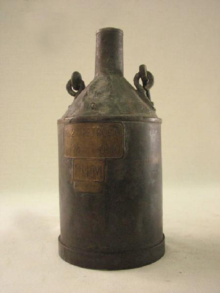 recipiente in lamiera a forma di cilindro terminante a forma di imbuto rovesciato con tappo metallico filettato.Dal corpo ad imbuto sporgono 2 anelli per i ganci di una maniglia mobile per il trasporto del contenitore.Sul retro una maniglia fissa . Sul davanti n° 3 targhette in rame apposte verticalmente.La superiore con la scritta : Kg 2 petrolio e Kg 2,280 olio ;\nLa mediana con la scritta : FNM ;l'ultima con il nome del fabbricante : Olimpio Bertoni Milano.