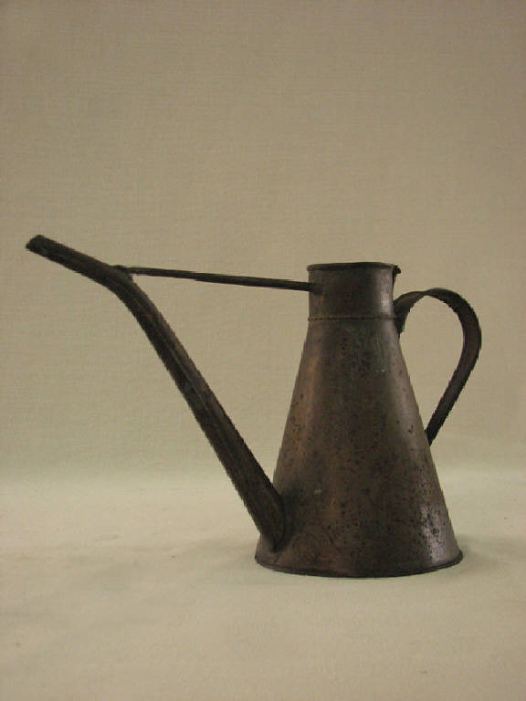 recipiente a forma di tronco di cono terminante in alto con un piccolo tratto cilindrico .Dal fondo parte in fuori in diagonale un beccuccio che termina all'altezza del bordo superiore piegando leggermente verso orizzotale.Il beccuccio è legato proprio all'origine della curvatura alla parte cilindrica del corpo con una astina metallica saldata ad entrambe le estremità. Sul dietro è saldata una presa rotondeggiante.