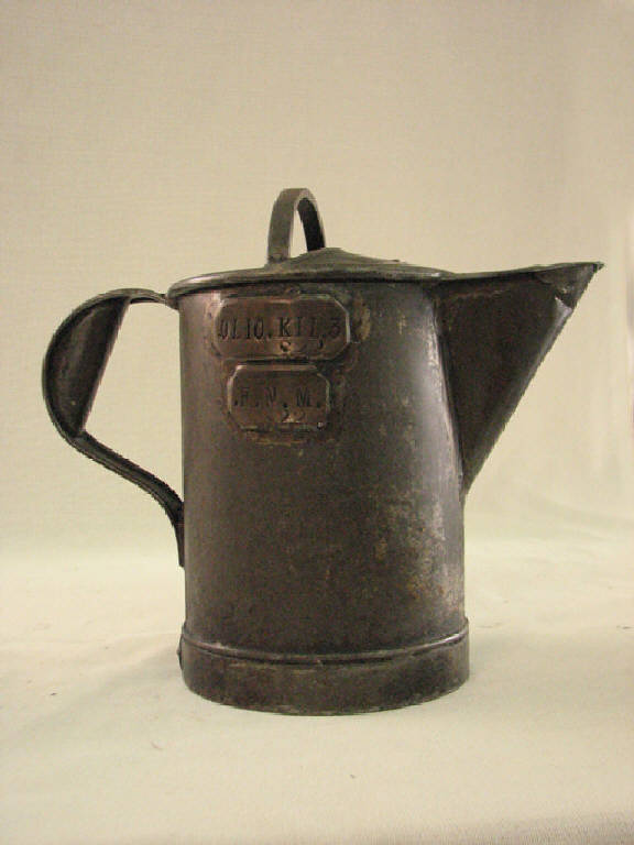recipiente a forma di caraffa leggermente rastremata verso l'alto.Semicoperchio fisso sul davanti con saldata una piccola presa ad arco.Beccuccio triangolare all'estremità superiore anteriore e manica ansata per presa saldata nella parte posteriore.