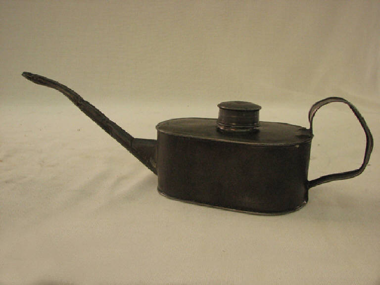 recipiente rettangolare leggemente rastremato verso il davanti con gli spigoli arrotondati.Sulla faccia superiore beccuccio di carico sporgente con tappo infilato a cappello.Manica ansata sul retro.Beccuccio lungo che esce diagonalmente dal davanti con l'estremità leggermente piegata in giù