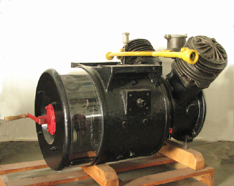 carcassa cava in acciaio ricavata in corpo unico per fusione , a forma prevalentemente cilindrica,dalla cui parte centrale sporgono due corpi con la superficie superiore piatta e forata per il fissaggio sotto la cassa di una elettomotrice.Un'estremità ha ,in continuità con il corpo centrale , un altro corpo cilindrico a diametro più ridotto dalla cui parte superiore fuoriescono, a forma di V ,due cilindri con la superficie esterna alettata.All'interno della carcassa è alloggiato un motore elettrico il cui albero terminale si trova nel restringimento cilindrico.Su tale albero è calettata una manovella con contrappeso opposto ed al cui bottone sono incernierate due bielle che con il relativo pistone scorrono dentro i cilindri alettati,aspirando e pompando aria.Dalla base della V partono i raccordi tubolari che inviano l'aria in appositi serbatoi ,che si trovano sotto la cassa del veicolo.Delle vaschetto d'olio alimentate dall'esterno permettono la lubrificazione degli organi in movimento.Dal fronte retro della carcassa escono i morsetti dei cavi per l'alimentazione elettrica del motore,proveniente direttamente dalla linea a 3000 V cc.