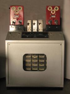 armadio di lamiera verniciata leggermente rastremato nella parte anteriore superiore in cui è ricavata una finestra di plexiglass sotto cui si trova un pannello retroilluminato.Sul pannello è rappresentato il cosiddetto piano schematico della stazione dentro cui è situato l'armadio,cioè : i binari,gli scambi,i segnali,i passaggi a livello.Nel caso specifico quello della stazione di Bruzzano.\nSopra l' armadio sono installate alle due estremità due scatole dal tipico colore rosso,chiamate istrumenti di blocco.Sulla loro faccia frontale vi sono maniglie,pulsanti,finestre rotonde,chiavi,lampade.\nTra i due istrumenti sono installate n° 3 scatole al centro delle quali sporge una chiave.\nLe finestre tonde sono avvisatori ottici con schermo cangiante nei colori bianco ,rosso,verde