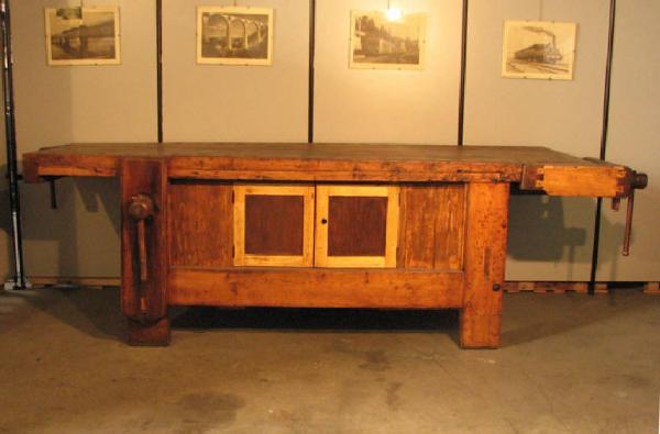 piano di lavoro rettangolare di elevato spessore ( 18 cm ) poggiante su una intelaiatura a 4 piedi uniti da 4 travese tutte a sezione quadrata dello stesso spessore del piano di lavoro.Tra le traverse ed il piano è ricavato un vano chiuso con due sportelli,Sul piano son ricavati lungo i lati lunghi due serie di fori rettangolari.Due morse con tavole di legno e con vite in legno applicate sui due lati brevi ed una più grande sul lato lungo anteriore.