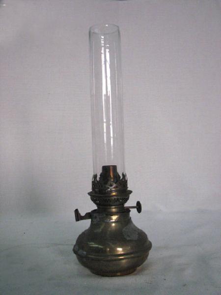 base in ampolla d'ottone su cui è innestato il gruppo portastoppino con ghiera ricamata a traforo per l'infilaggio della canna di vetro parafiammella; alla base del portastoppino un pomello per alzare lo stoppino man mano che si consuma e ,opposto ,una linguella in ottone per permetterne l'attaco ad una mensola;all'interno lo stoppino in canapa intrecciata