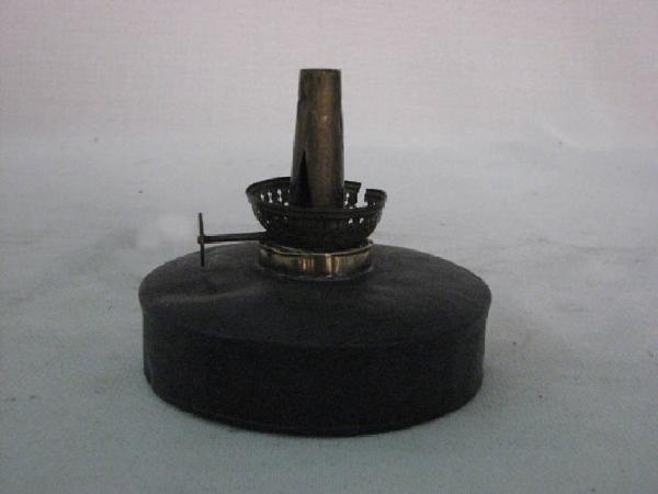 base formata da un serbatoio a forma cilindrica sopra la quale ,al centro,era montato un portastoppino con una basetta a tazza rotonda con la parete traforata ed un beccuccio che fuoriesce dal centro.\nAlla base del portastoppino un pomellino a ruota per la regolazione dell'altezza dello stoppino.All'interno uno stoppino di canapa o cotone a fili intrecciati