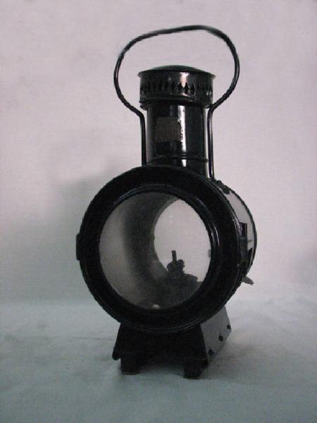 cilindro orizzontale in lamiera verniciata nera con sportello circolare con vetro sul davanti e fondo chiuso sul retro,poggiante su un supporto scatolato rettangolare.Dal sopra fuoriesce un tubo chiuso all'estremità con coperchio forato per areazione.Sul tubo è saldato un manico.All'interno su apposita sede è fissato un lumino ad olio.Un botola sul fianco permetteva l'accensione e lo spegnimento.