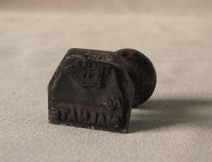 timbro con impugnatura in legno e stampo in gomma a forma quadrata tagliata in un angolo