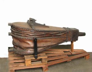 mantice con coperchio a forma di pera in legno e soffietto in cuoio con borchie metalliche.Estremità a forma di cubo metallico da cui spunta il tubo circolare per l'aria.Sul fondo sede piena per leva di movimento e gancio per sospensione.
