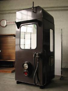 ricostruzione angolo lato macchinista della cabina n° 2 di una elettromotrice.Sono evidenziati, all'interno ,il banco di manovra tipo T.I.B.B.; la pulsantiera di comando ;il volmetro e l'amperometro.All'esterno il fischio,; il cavo multiplo per la trasmissione dei comandi in un treno bidirezionali;la fanaleria