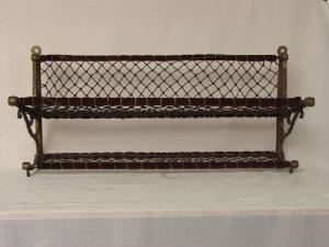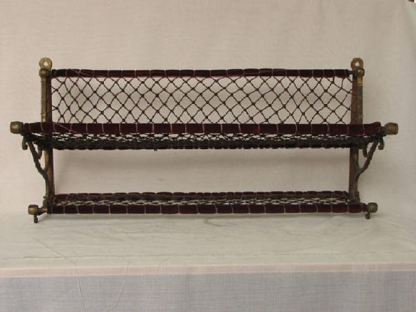 telaio di ottone come spalliera con a sbalzo due telai rettangolari ,più grande quello superiore .I piani di appoggio e la spalliera sono maglie di corda di canapa.Il telaio era avvolto dello stesso velluto rosso utilizzato per i sedili sottostanti.\n\n\n\n\n\n\n\n\n\n\n\n\n\n\n\n\n\n\n\n\n\n\n\n\ni piani di appoggio e la spalliera sono ottenuti con magli di corda di canapa