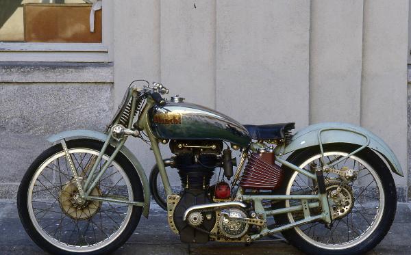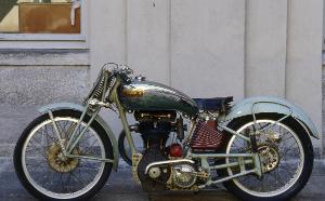 Motocicletta da corsa con telaio rigido a culla aperta a tripla forcella e parafanghi verniciati di celeste, mentre il serbatoio è cromato insieme alla altre parti lucide. Al centro del telaio è sistemato il motore moniclindrico verticale a quattro tempi, con valvole in testa, comandate da due alberi a camme; il tubo di scarico si trova sul fianco sinistro della motocicletta. Al di sopra del motore è sistemato il serbatoio del carburante; il serbatotio dell'olio invece si trova al di sotto della sella del pilota e presenta una superficie alettata, verniciata di bordeau. La trasmissione è a catena. Il cambio è comandato da un doppio pedale a bilanciere sul fianco sinistro. Sospensione posteriore è a ruota guidata, mentre la ruota anteriore è connessia con una forcella a parallelogramma. Sul manubrio è fissato un frontalino ellittico in legno per il numero di gara.