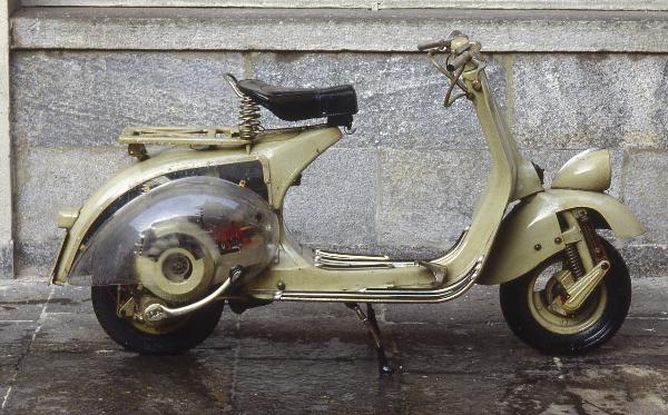 Scooter con scocca portante a guscio, verniciata di grigio chiaro. Il cofano motore e lo sportello per la camera del carburatore sono stati sostituiti da copie in plastica trasparente a scopi didattici. All'interno della carenatura si trova un motore monocilindrico a due tempi, azionante direttamente la ruota posteriore; il motore è stato sezionato per la visione delle parti di cui è costituito. L'avviamento del motore avviene mediante pedovella posta sul fianco sinistro. I comandi si trovano sul manubrio, in corrispondenza delle impugnature, e consistono in un commutatore per l'accensione dei fanali e del clacson, una leva per il freno anteriore e una per la frizione e di accelerazione; il comando per il freno posteriore è costituito dal pedale presente sulla pedana. Il fanale anteriore è sistemato sul parafango. Il parafango anteriore e l'ammortizzatore sono parzialmente sezionati per la visione del funzionamento del sistema di sospensione.