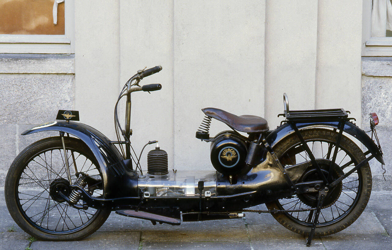 Motocicletta con telaio in lamiera stampata a longheroni, carrozzeria e serbatoio verniciati di nero brillante; il telaio presenta una forma particolarmente bassa e allungata, con un largo parafango anteriore dotato di ali laterali sulle quali si trovano delle feritoie. Al centro del telaio è montato un motore monocilindrico verticale a due tempi, chiuso da un cofano in plastica trasparente ad eccezione del gruppo testa-cilindro che rimane scoperto. Il serbatoio del carburante ha una forma cilindrica ed è posto trasversalmente sotto la sella del conducente. La motocicletta è sprovvista di sospensione posteriore, mentre la sospensione anteriore è a molle. Lo sterzo è indiretto, simile ad uno sterzo automobilistico. Sopra il parafango posteriore è situato il portapacchi, provvisto di portaccessori in pelle sui lati. Il cavalletto reggimacchina è situato sulla ruota posteriore. Sul parafango anteriore è rappresentato un capo indiano.