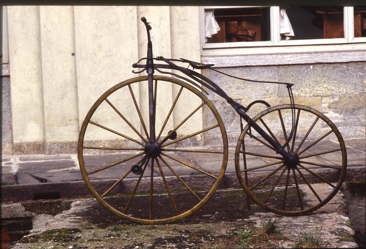 Biciclo con telaio, forcella e manubrio in ferro forgiato. Un piccolo paracosce è sistemato al di sopra della ruota anteriore, a protezione delle gambe del guidatore durante le curve. Una pedivella situata nella parte posteriore sinistra del telaio consente di montare sulla sella, costituita da una sottile lamina di metallo, rivestita con della pelle, senza imbottitura; la sella inoltre è sospesa elasticamente su una balestra in lamina metallica, sorretta posteriormente da due barre in metallo, leggermente ricurve, inserite nella parte posteriore del telaio. Il biciclo dispone di un freno a pattino sulla ruota posteriore, azionato dalla manopola del manubrio, per mezzo di una funicella e di una lunga leva. Il funzionamento si basa su due pedali in metallo, applicati al mozzo della ruota anteriore. Il veicolo poggia su due ruote con razze in legno e cerchiatura in metallo; i cerchi e i raggi presentano una verniciatura dorata, con tracce di una preesistente colorazione gialla. Le ruote, pur avendo dimensioni differenti, contano entrambe 14 razze.