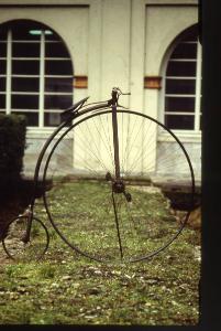 Biciclo da corsa con telaio tubolare in ferro e forcella in lamiera. Un piccolo paracosce, costituito da un telaietto in metallo originariamente rivestito da una striscia di pelle, è sistemato al di sopra della ruota anteriore, a protezione delle gambe del guidatore durante le curve. Una predellina situata nella parte posteriore destra del telaio consente di montare sulla sella, sistemata su una balestra fissata sul telaio; la sella è in pelle, leggermente imbottita. Il piccolo manubrio ribassato presenta manopole in legno. Il biciclo è provvisto di freno a pattino agente sulla ruota anteriore, comandato a bacchetta da una leva sul manubrio. Il funzionamento si basa su due pedali registrabili in metallo, applicati alla ruota anteriore. Il biciclo poggia su due ruote di dimensioni diverse, predisposte per battistrada in gomma piena; le ruote, di dimensioni differenti, sono entrambe dotate di raggi tangenti.