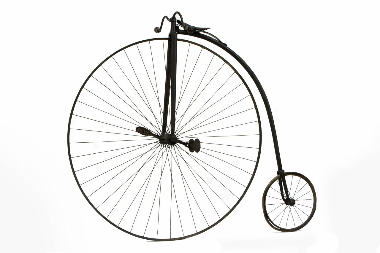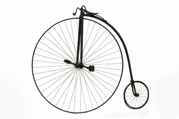 Biciclo da corsa, con telaio tubolare in ferro e forcella in lamiera. La sella, sospesa elasticamente su una balestra fissata sul tubo obliquo del telaio è costituita da una lamina di metalli, originariamente rivestita di pelle. Il piccolo manubrio ribassato presenta manopole in legno. Il biciclo è sprovvisto di impianti frenanti. Il funzionamento si basa su due pedali registrabili in metallo, applicati alla ruota anteriore. Le due ruote, entrambe con cerchio e raggi in metallo, sono concepite per battistrada in gomma piena; la ruota anteriore presenta 44 raggi radiali, mentre la ruota posteriore conta 18 raggi.