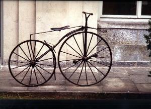 Biciclo con telaio, forcella e manubrio in ferro forgiato. Il telaio, prolungato sulla ruota anteriore, termina frontalmente con un riccio; al di sopra della ruota, inoltre, il telaio presenta due ali laterali per l'appoggio delle gambre del conducente durante la marcia a ruota libera. Al di sopra della ruota anteriore, inoltre, è sistemato un paracosce a protezione delle gambe del conducente. Il posto di guida è costituito da una sella imbottita in pelle, sospesa elasticamente su una balestra in lamina metallica; la balestra è sorretta posterioremente da due barre in metallo, leggermente ricurve, inserite nella parte posteriore del telaio. Il manubrio dritto presenta manopole in legno tornito. Il biciclo dispone di un freno a pattino sulla ruota posteriore, comandato dalla rotazione della manopola del manubrio azionante a funicella una lunga leva.; il freno è dotato di una molla di ritorno. Il manubrio dritto presenta manopole in legno tornito. Il funzionamento del biciclo si basa su due pedali in metallo, applicati al mozzo della ruota anteriore. Il veicolo poggia su due ruote con razze in legno e cerchiatura in metallo; le ruote, pur avendo dimensioni differenti, contano entrambe 16 razze.