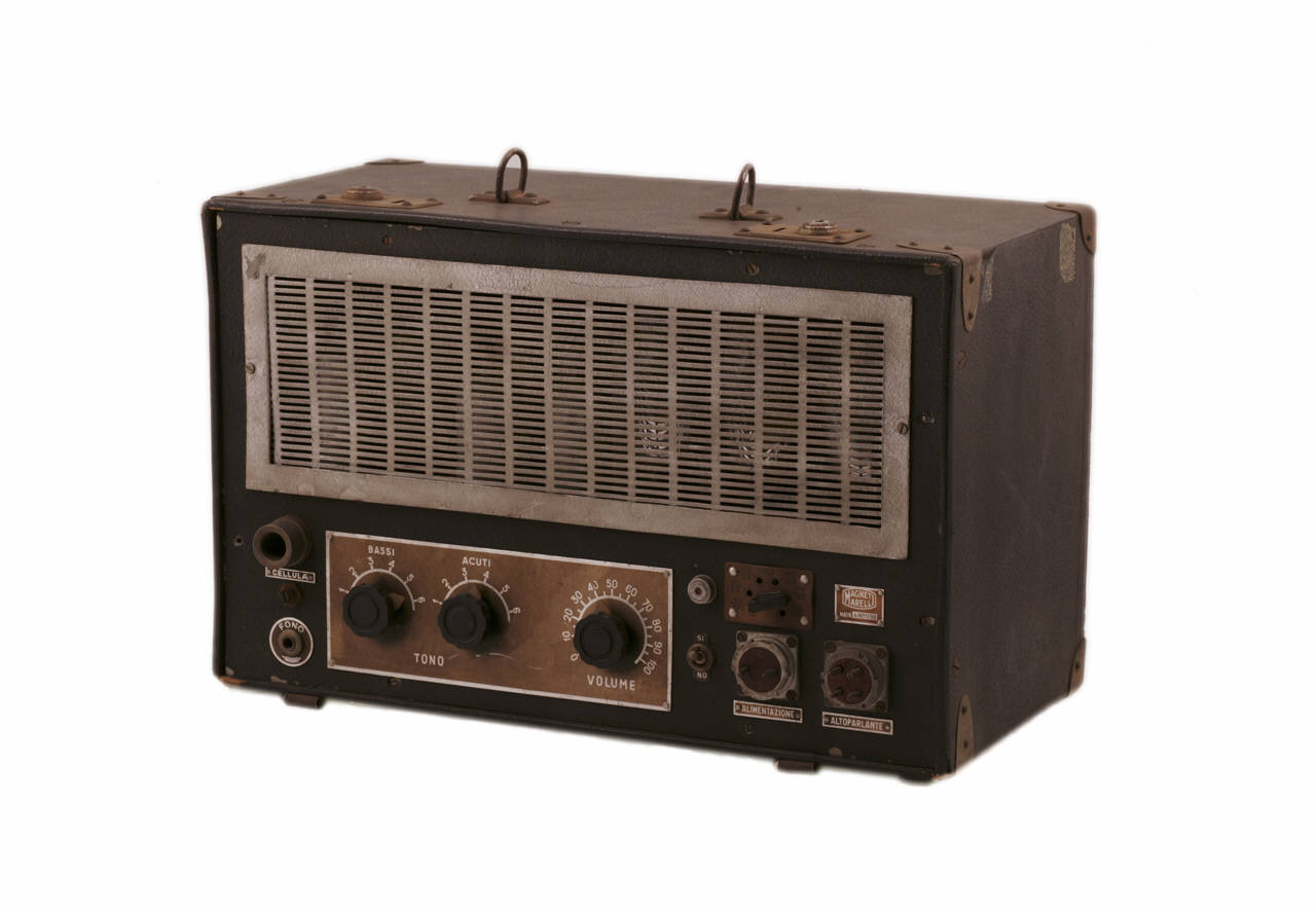 Amplificatore a tre valvole collocato in una scatola di legno, rivestita da tela cerata di colore antracite. Il lato anteriore è chiuso da un pannello in metallo, anch'esso di colore antracite. Su questo pannello sono sistemati i comandi operativi dell'amplificatore: due selettori in bachelite nera, ruotabili su una scala graduata da 1 a 6, comandano i toni alti e i toni bassi, mentre un altro selettore analogo, posto su una scala graduata da 0 a 100, controlla il livello di volume. Nella parte sinistra del lato anteriore si trovano inoltre due boccole per l'ingresso del segnale mentre, nella parte destra, sono posizionati l'interruttore per l'accensione, lo spinotto per la selezione della tensione di alimentazione e due prese, una bipolare per il collegamento del cavo di alimentazione e una quadripolare per l'allacciamento dell'altoparlante. Sul lato frontale, infine, è situata infine una griglia in lamiera, asportabile per l'accesso diretto al vano delle valvole.