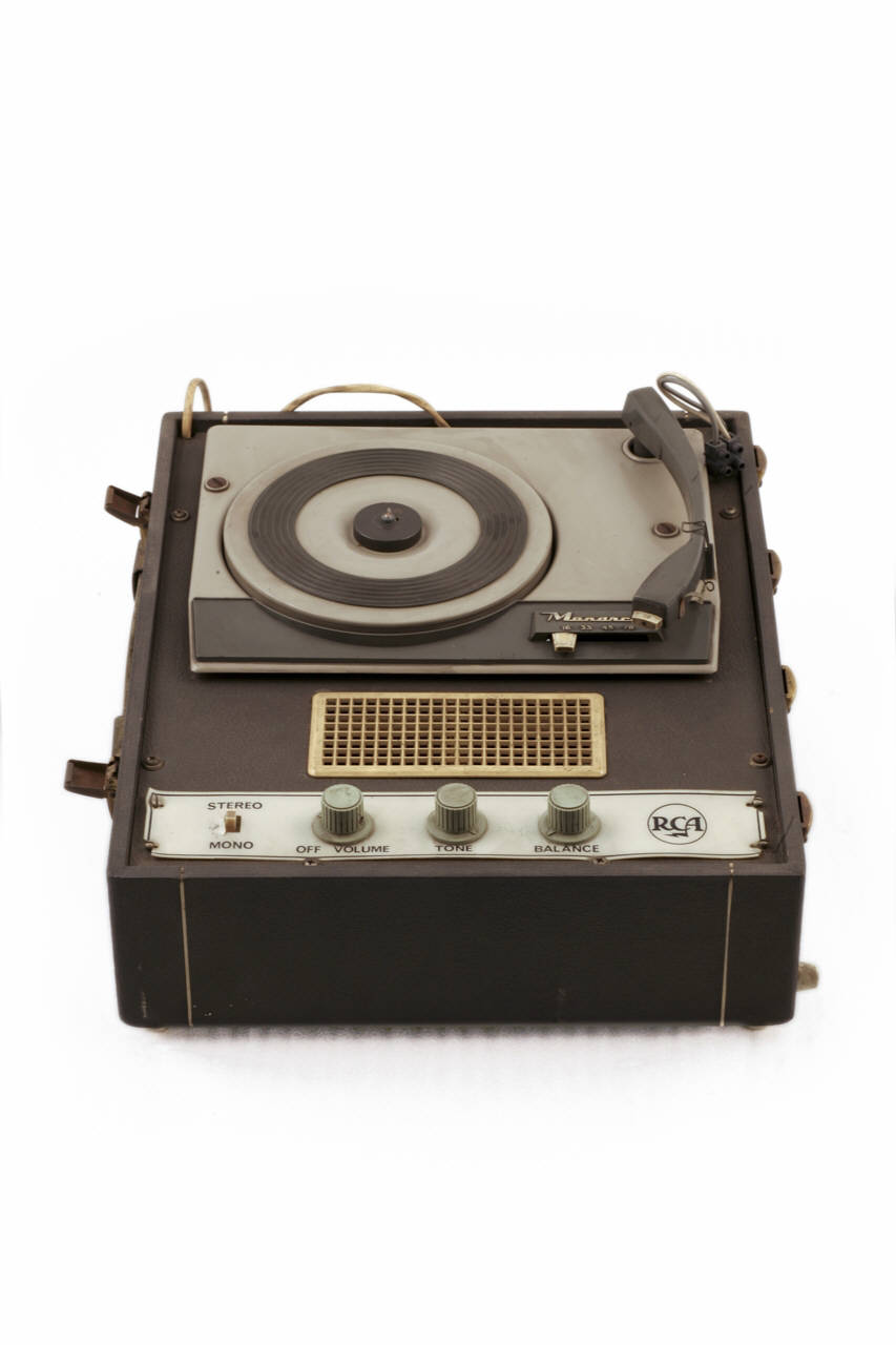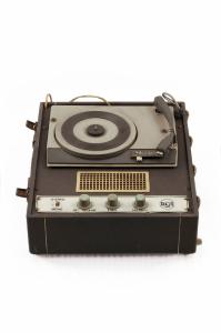 Giradischi costituito da una scatola in legno, rivestita di tela di colore grigio, all'interno della quale si trovano il motore elettrico, il dispositivo di pre e i circuiti. Sul piano superiore sono situati i comandi operativi, costituiti da un interruttore per la selezione della modalità di riproduzione stereo o mono e dai tre selettori del livello di volume, di tono e di bilanciamento. Il piatto e il braccio porta pick-up sono in plastica grigia, accanto al piatto si trova la leva per la selezione della velocità di riproduzione del disco a 16, 33, 45 o 78 giri; il pick-up è regolabile per la riproduzione di dischi a 78 o di durata più lunga. Sul piano inoltre si trova una presa d'aria chiusa da una mascherina in plastica bianca; altre due prese d'aria si trovano sul fondo, anch'esse ricoperte da una mascherina in plastica bianca. Dal bordo posteriore del piano escono i cavi elettrici per il collegamento del giradischi agli altoparlanti e alla rete di alimentazione. Il giradischi è chiuso da un coperchio in plastica trasparente non originale.