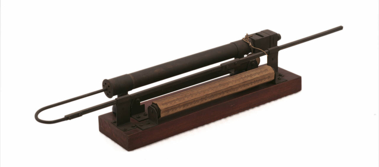 tubo in ottone provvisto di uno stantuffo, ad una estremità, e una imboccatura in legno tornito all'estremità opposta. Lo stantuffo viene mosso dall'aria immessa attraverso l'ausilio di un mantice a pedale (non presente). Ad ogni movimento dello stantuffo corrisponde un valore segnato su un cilindro mobile graduato (scale segnate su carta), indicato da un cursore collegato allo stantuffo. Il tubo e il cilindro sono fissati su una base in legno di forma rettangolare.