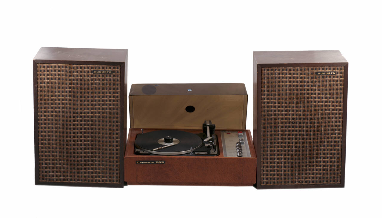 Impianto stereofonico costituito da un giradischi con amplificatore incorporato e due casse. Il giradischi è costituito da una base in legno, rivestita esternamente di pelle sintetica marrone, e da un coperchio in plastica trasparente fumé. All'interno della base si trovano il motore elettrico e l'amplificatore; il fondo, poggiante su quattro piedini di gomma, è asportabile per l'accesso diretto alle parti meccaniche ed elettroniche. Il piatto, di produzione Dual, è collocato sul piano superiore della base, affiancato dal braccio porta pick-up. Le levette che comandano le operazioni di riproduzione del disco sono posizionate attorno al piatto: a sinistra si trova la levetta per la selezione della velocità del disco (33, 45, 78 giri) mentre a destra si trovano altre tre levette per la selezione della grandezza dei dischi di dimensione intermedia (17,25, 30), per il controllo dell'abbassamento/sollevamento della testina ed infine per la selezione tra il comando automatico o manuale del braccio. Accanto alla piastra, nella parte destra del piano superiore, sono sistemati i comandi dell'amplificatore. Questi comandi consistono in cinque pulsanti in plastica metallizzata, relativi al segnale di ingresso nell'amplificatore, e quattro manopole relative al segnale in uscita. I pulsanti consentono la selezione del dispositivo di ingresso del segnale (radio, pick-up, registratore) e delle caratteristiche del segnale stesso (scratch, mono-stereo); le manopole controllano gli aspetti del segnale in uscita, ovvero il bilanciamento, il volume e le frequenze dei suoni alti e dei suoni bassi. L'interruttore per l'accensione dell'apparecchio è il tasto rosso, affiancato da una spia luminosa, posto nell'angolo in alto a destra. Sul lato posteriore si trovano le prese per i collegamenti: in corrispondenza dell'amplificatore, si trovano due supporti a cinque poli per il collegamento alla radio e al registratore a nastro; in corrispondenza del piatto giradischi si trovano il cavo di alimentazione, due supporti bipolari per il collegamento delle casse, uno supporto a cinque poli per la cuffia, due fusibili e un supporto bipolare in uscita; accanto all'uscita del cavo elettrico è posto il selettore della tensione di alimentazione. Sul coperchio in plastica sono presenti due adesivi rappresentanti una macchina fotografica e una motocicletta.\nLe due casse sono costituite da una scatola in legno con il lato posteriore svitabile per l'accesso agli altoparlanti; il lato anteriore è costituito dalla rete in tessuto. All'interno di ogni cassa sono montati un tweeter e un woofer.