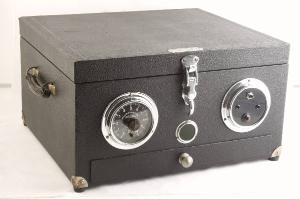 Macchina con struttura in legno, rivestita esternamente di tela cerata di colore blu elettrico. Ai lati della macchina sono presenti due maniglie. Il coperchio, rivestito internamente con spugna, è fissato con una giuntura a pantografo. All'interno si trova un piano di lavoro in cristallo che ricopre la cassa contenente quattro lampade. Al di sotto della lastra di cristallo inoltre si trovano due lastre di vetro, tra le quali è inserito un foglio plastificato bianco. Nella parte frontale si trovano la serratura a gancio e due quadranti circolari: nel quadrante sinistro è situato l'orologio contaposa, mentre nel quadrante destro, in ebanite, si trovano due interruttori indipendenti. Tra i due quadranti si apre un oblò più piccolo, col vetro di colore verde, che funge da spia di controllo per l'illuminazione della cassa. Sempre sul lato frontale si apre un cassetto fornito di un'impugnatura centrale in ebanite. Sul retro della macchina si trova l'attacco per il cavo elettrico.