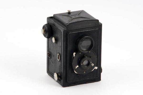 Apparecchio fotografico di forma parallelepipeda e piccole dimensioni, in metallo verniciato.\nSuperiormente troviamo il mirino a pozzetto apribile, con paraluce in metallo.\nFrontalmente sono inseriti, uno sopra l'altro due obiettivi: quello superiore, di traguardazione, per la messa fuoco e l'altro, di ripresa, per l'esposizione della pellicola, che comprende diaframma a iride e otturatore centrale.\nI due obiettivi sono posti ad una distanza di qualche centimetro per cui l'errore di parallasse è minimo.\nDietro al primo obiettivo, all'interno dell'apparecchio è inserito uno specchietto inclinato.\nSul secondo obiettivo sono inseriti i dispositivi di regolazione della velocità di scatto dell'otturatore (1/25, 1/50 di secondo più la posa B in cui l'otturatore resta aperto fino a che non si rilasci il dispositivo di scatto), di messa fuoco a soggetto (ritratti, gruppi, paesaggi, per distanze di ripresa da 1m a infinito), di apertura del diaframma (con posizioni 9, 11, 22).\nLa levetta per lo scatto dell'otturatore è inserita sul secondo obiettivo in corrispondenza dell'otturatore stesso posizionato all'interno.\nE' inoltre presente un foro per l'inserzione di uno scatto flessibile.\nAprendo la parete posteriore ed inferiore dell'apparecchio si accede all'interno per il posizionamento e la sostituzione della pellicola in rullo (per formati 6x9cm) su due bobine posizionate sopra e sotto la camera oscura.\nMediante quattro fermi apribili dall'esterno è possibile inserire o levare il rullo.\nAll'esterno, lateralmente, è inserita la rotella per l'avanzamento della pellicola.\nSotto l'apparecchio sono presenti una finestrella ricoperta da un vetrino rosso per la lettura del numero del fotogramma direttamente sul retro della pellicola e un foro filettato che permette il posizionamento su un trepiede.