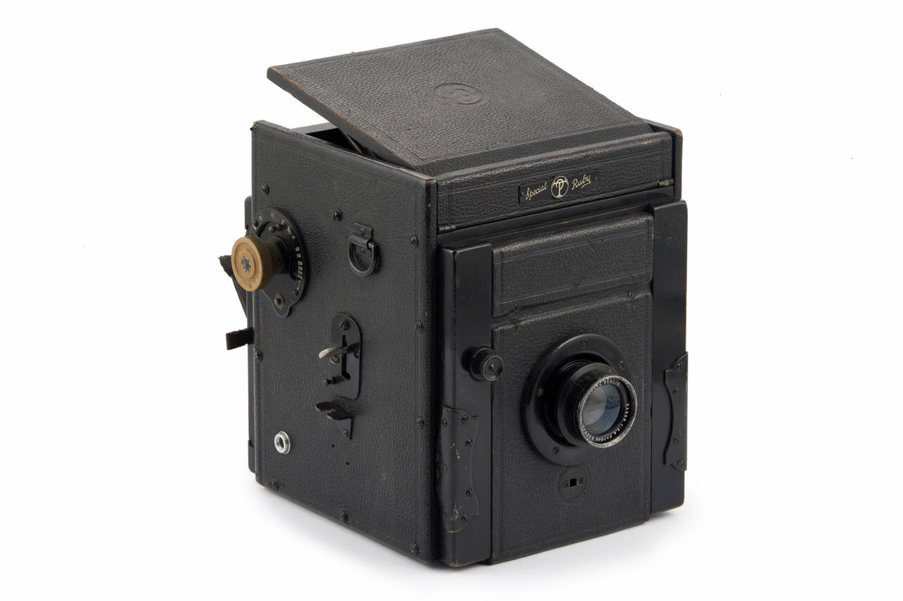 Apparecchio fotografico in legno ricoperto in pelle con soffietto ricoperto in pelle. Lateralmente è presente una maniglia in cuoio e pelle per il trasporto e l'impugnatura. Sono inoltre presenti due anelli per l'inserimento di una tracolla per il trasporto.\nIl soffietto è ripiegato all'interno della macchina e può essere estratto con facilità ruotando l'apposita manopola posta vicino alla maniglia.\nUna volta estratto, il soffietto è sorretto e mantenuto in posizione da due aste in metallo.\nDavanti al soffietto, sulla parete frontale, è inserito l'obiettivo su una lastra in legno rettangolare. La posizione del porta obiettivo è regolabile in verticale mediante una vite per il fissaggio nella posizione desiderata.\nLa messa a fuoco dell'immagine avviene ruotando la manopola che permette la regolazione della posizione del soffietto, permettendo quindi di modificare la distanza tra obiettivo e lastra fotografica.\nAll'interno dell'obiettivo è inserito un diaframma a iride. L'apertura del diaframma veniva regolata ruotando una ghiera posta sull'obiettivo in corrispondenza del diaframma stesso (indicazioni numeriche da 6,8 a 38).\nSul retro dell'apparecchio, dalla parte opposta dell'obiettivo, è inserito il porta lastra (formato 9x12cm) estraibile. Nel porta lastra è inserito un vetro smerigliato, utilizzato per l'inquadratura e la messa a fuoco, protetto da un paraluce apribile in pelle.\nIl porta lastra può essere sfilato lateralmente per caricare la lastra fotografica e può essere ruotato di 90° per permettere riprese orizzontali e verticali.\nL'apertura del porta lastra permette la visione interna dell'apparecchio. Sono visibili l'otturatore a tendina avvolgibile e la camera oscura con uno specchio a 45°.\nI tempi dell'otturatore sono regolabili attraverso una rotella posta lateralmente sul dorso dell'apparecchio, in prossimità dell'otturatore (tempi da 1/10 di sec a 1/1000 di sec).\nEra possibile comandare l'otturatore sia in maniera manuale attraverso un meccanismo a molla con comando esterno posizionato sul fianco dell'apparecchio, che tramite un comando pneumatico collegabile ad un apposito dispositivo collocato sempre sul fianco.\nLo specchio interno riflette l'immagine che viene visualizzata dall'obiettivo su di uno specchio smerigliato posizionato superiormente (9x9cm). Per la visione dall'alto, l'apparecchio è dotato di un mirino a pozzetto in pelle a doppia estensione ripiegato all'interno di un coperchio in legno e incernierato su un lato. Aprendo il mirino a pozzetto si attiva una levetta che posiziona lo specchio a 45°.\nSotto all'apparecchio sono presenti due fori filettati per il posizionamento eventuale su un cavalletto e quattro piedini d'appoggio in metallo.