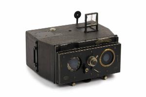 Questo apparecchio è costituito da due parti: il corpo macchina in legno di forma trapezoidale e il porta obiettivi in metallo.\nIl corpo macchina è costituito da due camere oscure ciascuna facente capo ad un obiettivo. I due obiettivi, montati su un unico telaio, sono mancanti.\nLa messa a fuoco avviene mediante un dispositivo a leve posto inferiormente che permette di avvicinare ed allontanare il telaio porta obiettivi.\nLa distanza di posa si legge superiormente su un archetto in metallo con tacche da 1,50 a infinito.\nLa posizione del porta obiettivi può essere regolata in verticale mediante un'apposita vite posta inferiormente.\nL'otturatore ha due modalità d'uso: istantanea e posa, selezionabili mediante una levetta posta al centro della parete frontale.\nLo scatto può avvenire attraverso un pulsante posto sopra al telaio porta obiettivi o con un comando pneumatico che può essere inserito nell'apposito dispositivo posto nel centro della parete frontale (il comando pneumatico è mancante).\nNel caso di ripresa istantanea, la velocità di scatto viene selezionata mediante una piccola rotella posta nel punto di inserzione del comando pneumatico di scatto (non è possibile la lettura di tali velocità).\nSulla parete superiore è presente un mirino estraibile costituito da una lente convessa con croce.\nSuperiormente una livella a bolla permette il corretto posizionamento dell'apparecchio.\nLa parete posteriore è scorrevole e permette di accedere alle camere oscure. All'interno di ciascuna camera oscura sono inseriti dei porta lastre in metallo (formato 7x9cm) tenuti in posizione da un dispositivo a molla.\nMediante una maniglia in metallo posta lateralmente all'apparecchio si procede all'inserzione davanti agli obiettivi delle lastre da impressionare. In corrispondenza di tale dispositivo è inserito un contalastre automatico.\nSullo sportello scorrevole è inserito un mirino per l'inquadratura, costituito da una piccola lente estraibile e regolabile in altezza.\nLateralmente e inferiormente sono presenti due fori filettati per l'inserzione su un cavalletto.